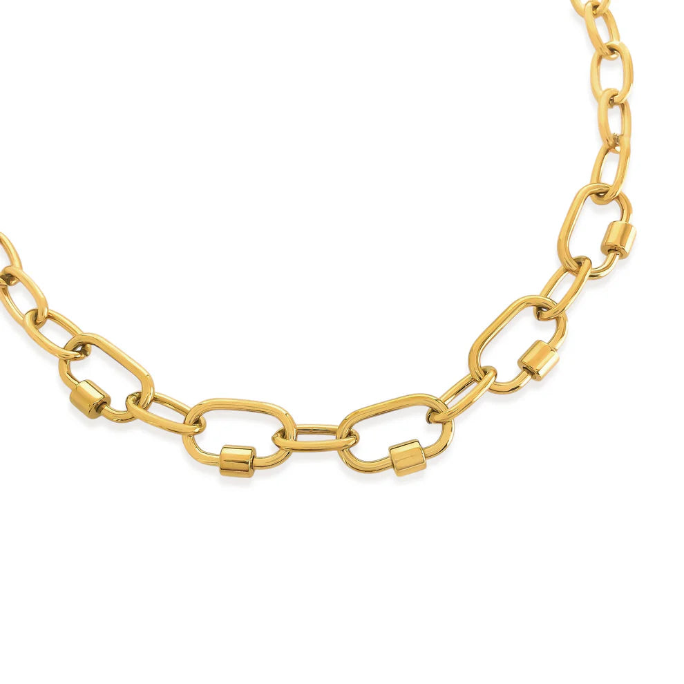 A striking fusion of modern edge and refined design, this Water Resistant chain necklace features five faux carabiners along its front, creating a bold focal point. The interlocking oval links flow seamlessly into this architectural detail.