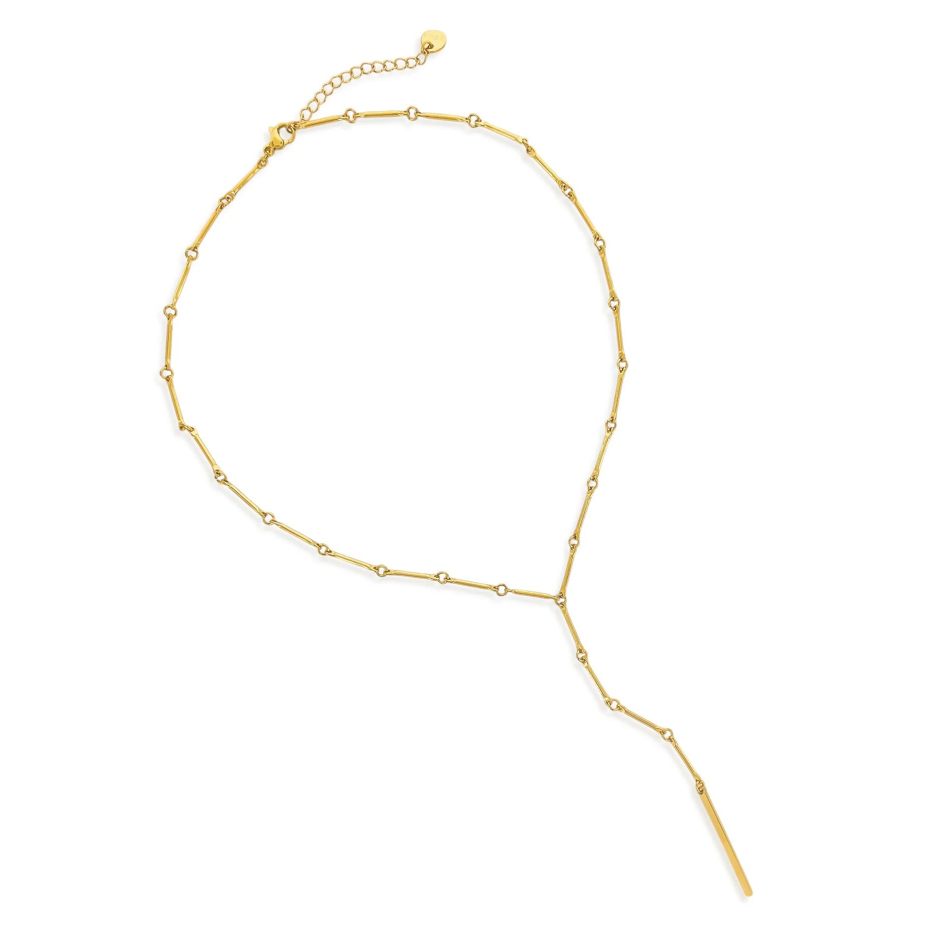 This delicate Water Resistant necklace features a Y-shape design, with slender bars and evenly spaced beads creating a graceful, elongated silhouette. A single vertical drop adds movement and elegance, drawing the eye downward for a flattering finish.